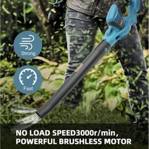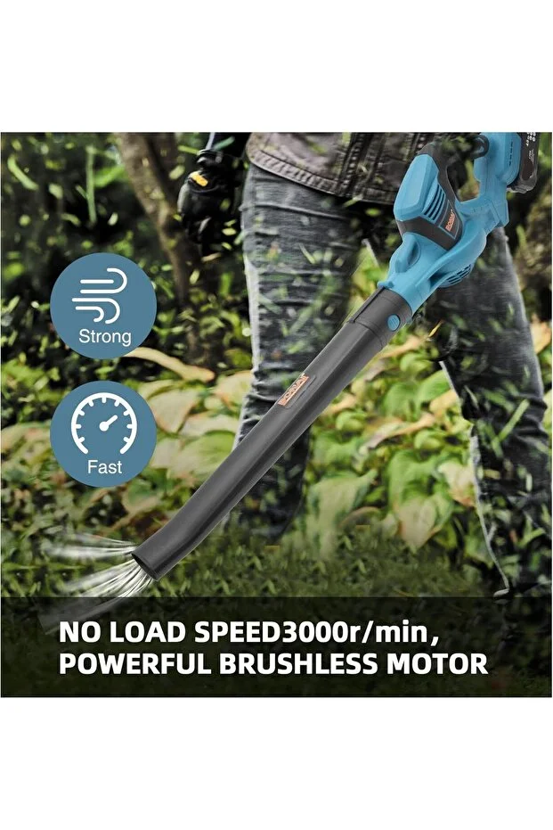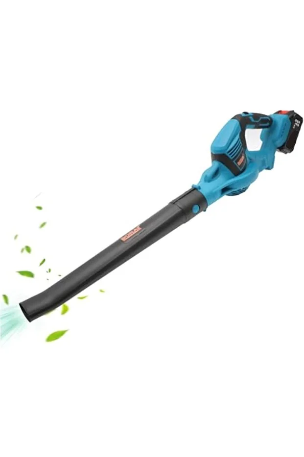 It features a rechargeable battery facilitating freedom of movement, speed control for airflow intensity, ergonomic lightweight design for portability, durable ABS material construction, and eco-friendly operation without exhaust emission.