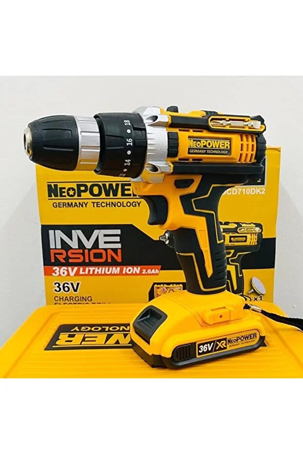 Neo Power Germany Technology 36v Cordless Drill With Two Batteries Chargeable 17 Pieces Bits In Kitbox For Drilling And Fastening.