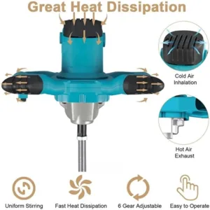 Its versatile design accommodates different container sizes and material volumes, while the variable speed control allows precise mixing for different consistencies.